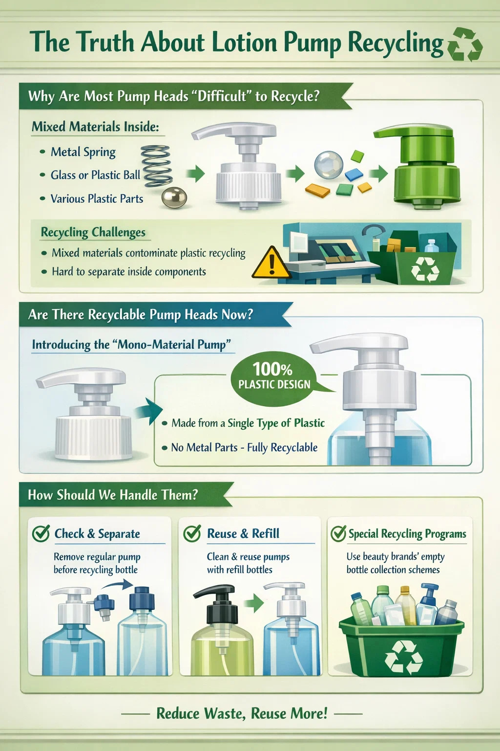 Recyclingproblemen: Recyclingmachines kunnen meestal maar één materiaal verwerken. Wanneer deze pompen, die een mix zijn van metaal en plastic, de recyclinglijn binnenkomen, hebben de machines moeite om ze te scheiden. Als ze niet worden gescheiden, zal de metalen veer een grote partij puur plastic "vervuilen" en zelfs de recyclingapparatuur beschadigen.