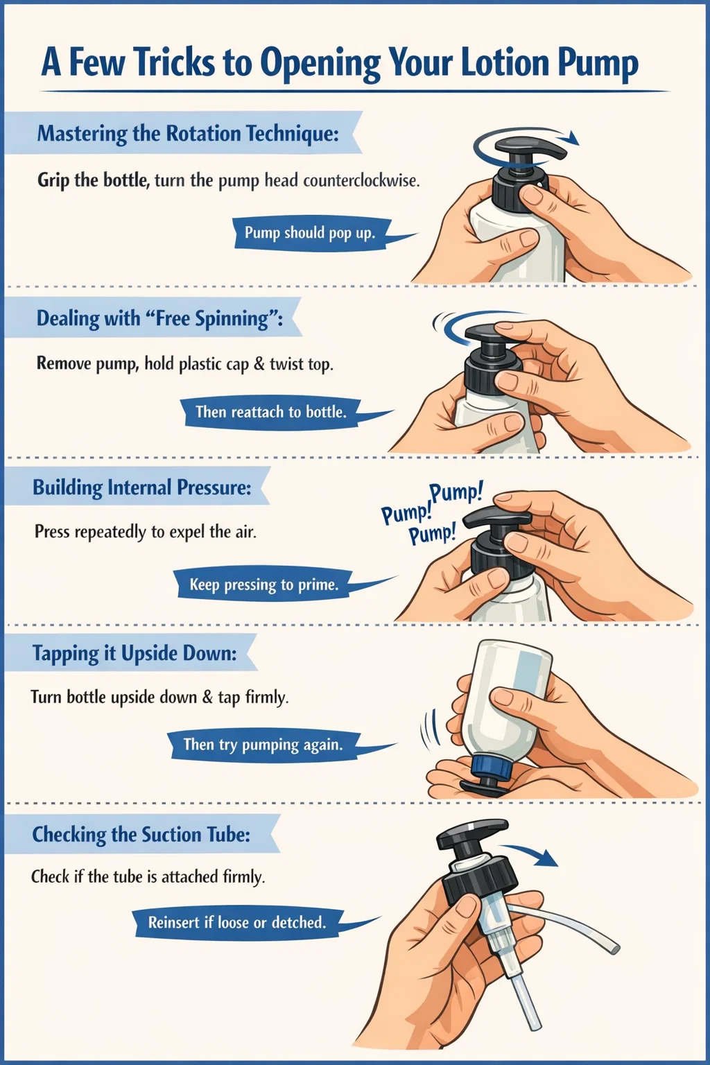 Het meest frustrerende aan nieuw aangeschafte huidverzorgingsproducten is vaak het lotionpompje dat maar niet wil bewegen. In feite zijn deze pompkoppen in de fabriek ontworpen met een speciaal vergrendelingsmechanisme om lekkage te voorkomen.