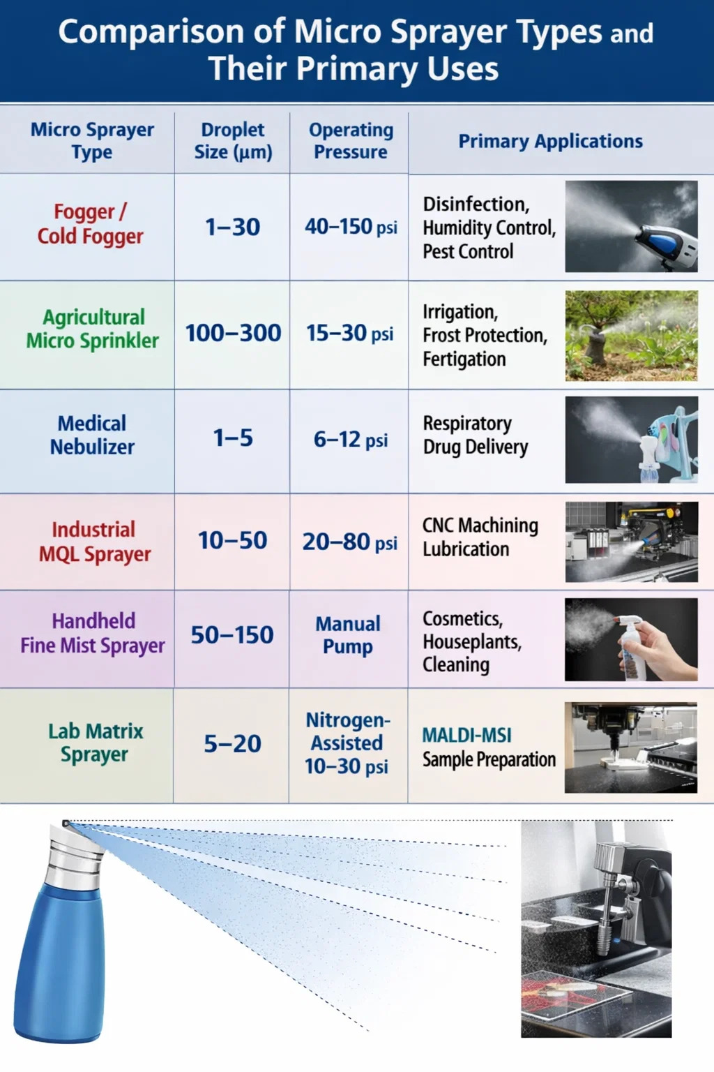 Verschillende microspuitconfiguraties zijn geoptimaliseerd voor specifieke toepassingen. Als u het verkeerde type kiest, resulteert dit in een slechte dekking, materiaalverspilling of schade aan apparatuur. De onderstaande tabel geeft een overzicht van de meest voorkomende typen microspuittoestellen, hun typische druppelgroottes, bedrijfsdrukken en beste gebruiksscenario's.