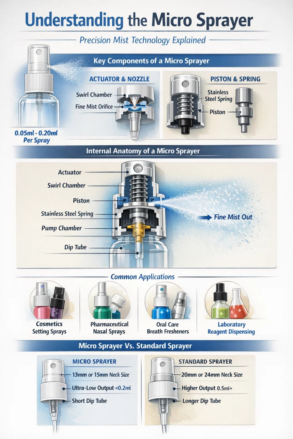 Om de vraag te beantwoorden "Wat is een microsproeier?" Het is een nauwkeurig ontworpen doseerapparaat dat is ontworpen om vloeistof om te zetten in een extreem fijne, consistente nevel met een zeer laag uitgangsvolume per slag. In tegenstelling tot standaard spuittoestellen die worden gebruikt voor huishoudelijke schoonmaakwerkzaamheden, a micro-sproeier varieert doorgaans tussen 0,05 ml en 0,20 ml product per keer, waardoor het de ideale keuze is voor hoogwaardige vloeistoffen waarbij doseringscontrole en delicate toepassing van het grootste belang zijn.